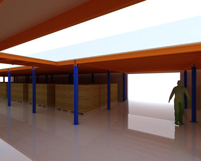 2.楼面板材——钢扣板 阁楼货架平台面铺完自制钢扣板的实景图(适合下层有采光要求的仓库,价格偏贵)。 |